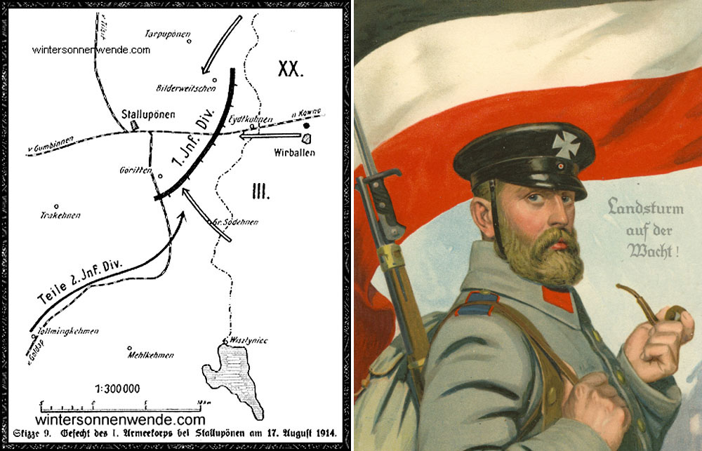 В то утро две российские армии под командованием генералов Ренненкампфа и Самсонова начали вторжение в Пруссию. На Шталлупёнен, находившийся в 10 километрах от границы, наступали четыре пехотные дивизии из 3-го и 20-го корпусов армии Ренненкампфа. Им противостояла всего одна немецкая дивизия ландштурма, которой было приказано задержать врага на сутки, а потом отступать на запад, к городу Гумбинен.