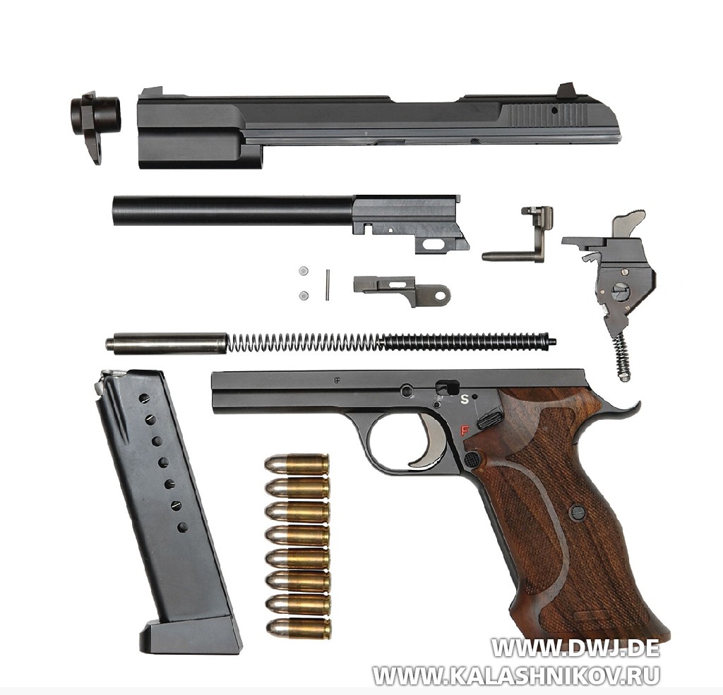 Неполная разборка пистолета Р211 с рамкой в сборе модели SIG P210–6. 1 — направляющая втулка ствола. 2 — затвор. 3 — рычаг затворной задержки, ось которого неподвижно соединяет с рамкой нижнюю часть личинки затвора с направляющими для роликов. 4 — группа УСМ.