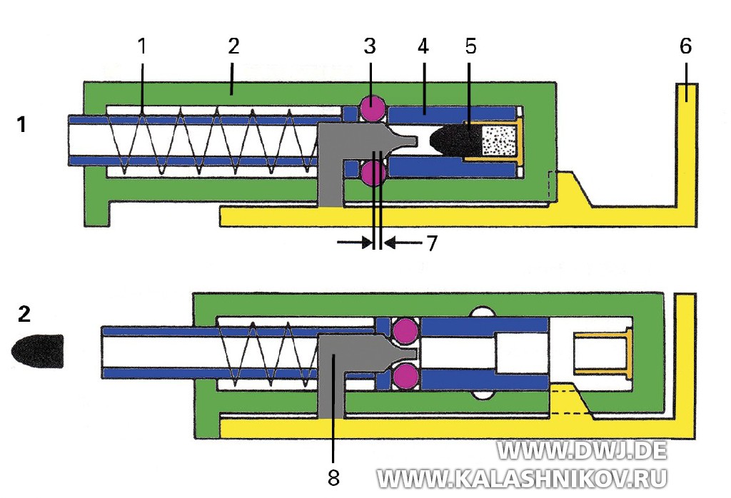 Кинематическая схема работы роликового затвора. Отчётливо видно параллельное расположение роликов относительно оси канала ствола при его запирании с использованием геометрического замыкания. Рис. 1: затвор закрыт. Рис. 2: затвор открыт. 1 — возвратная пружина.