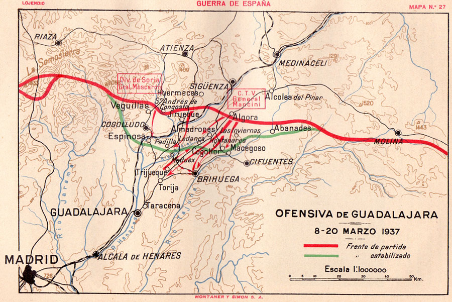 8 марта 1937 года, началась битва под Гвадалахарой, в которой испанская республиканской армия, ополченцы и интербригадовцы сумели нанести первое и, увы, единственное тяжелое поражение итало-фашистскому экспедиционному корпусу, воевавшему на стороне франкистских мятежников.