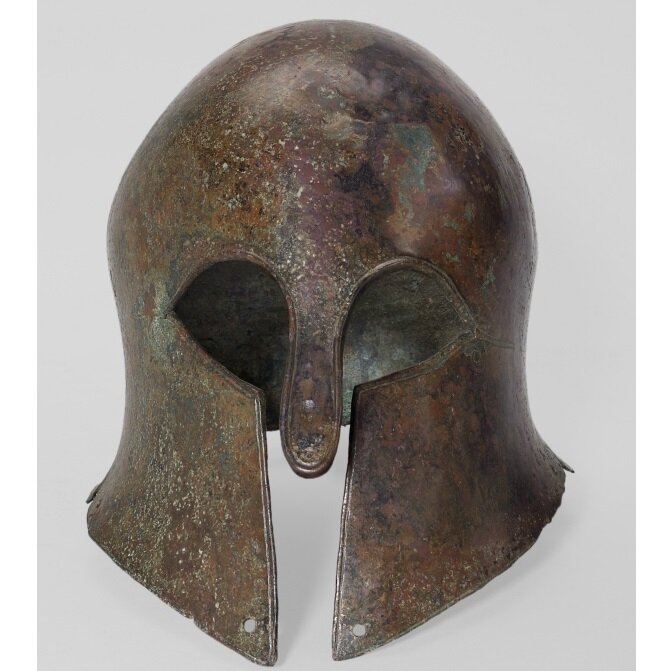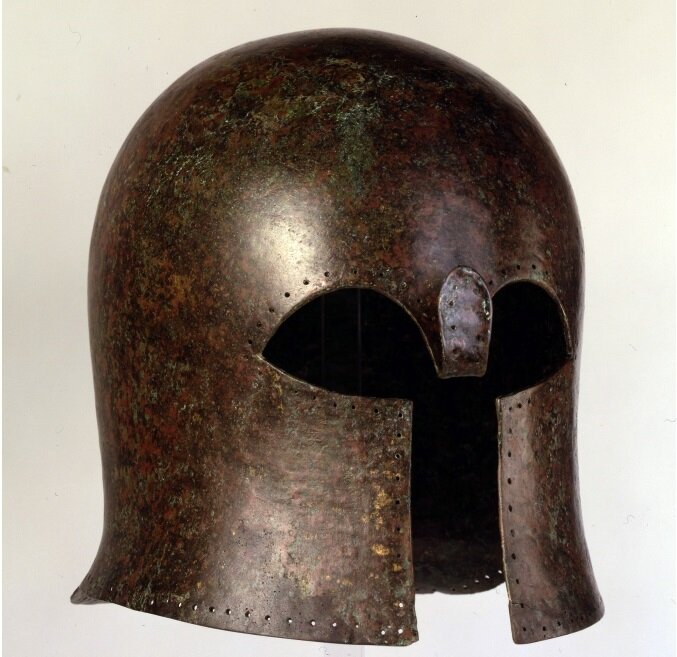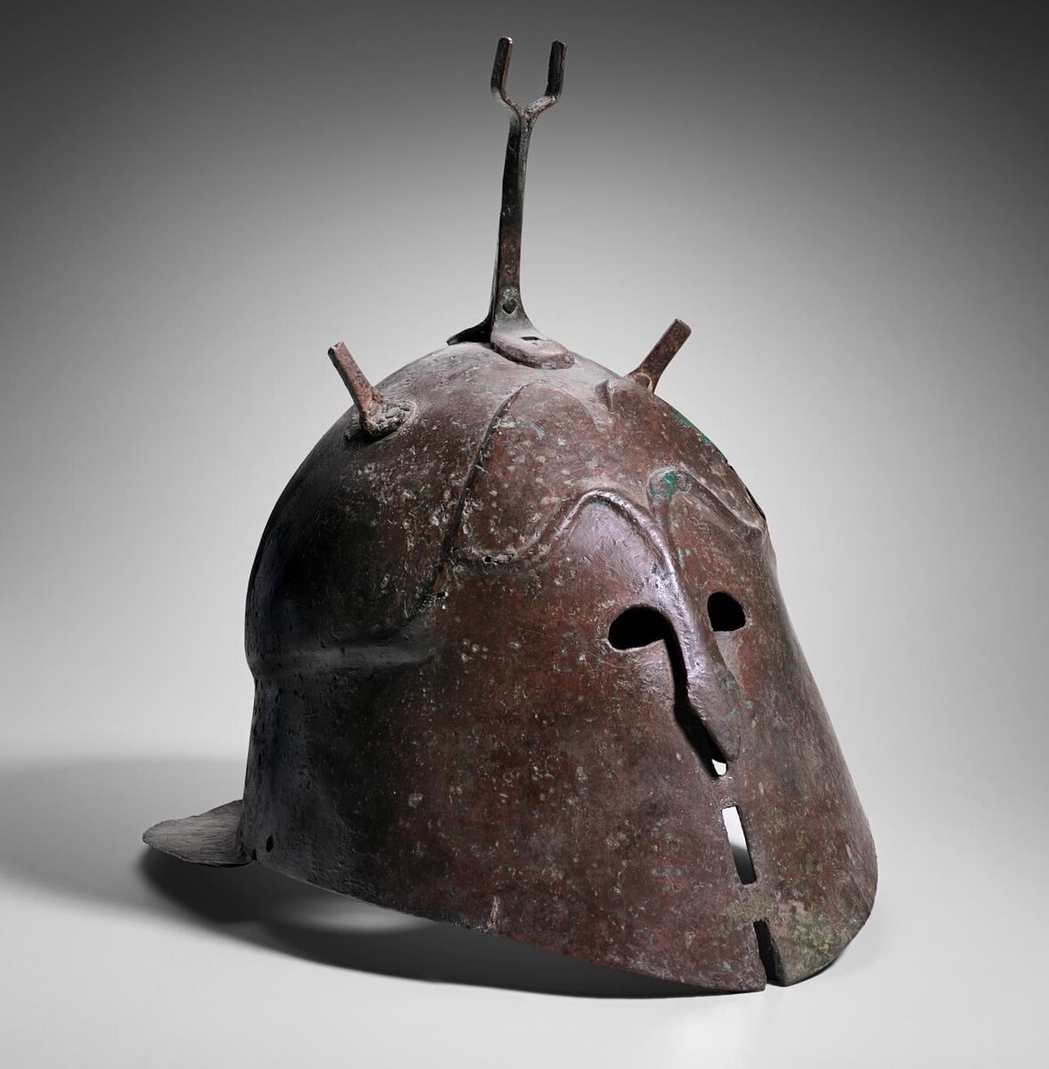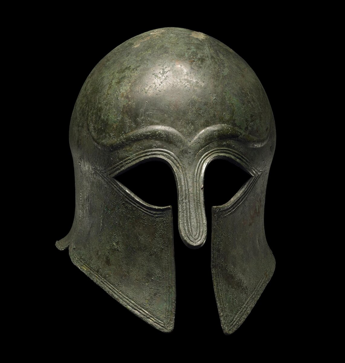 Тот самый знаменитый шлем. Пожалуй, самый эффектный, если брать поздние образцы. Ну и самый узнаваемый, конечно. Первые экземпляры коринфского типа относятся к VII в. до н. э. Они, как и иллирийские, были призваны избавиться от недостатков кегельхельма.
