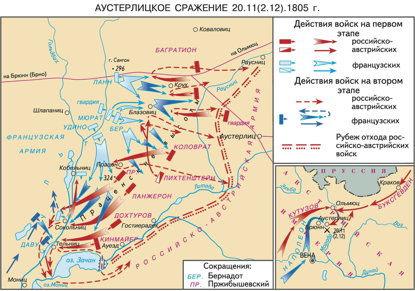 Наполеон, как бы, подыгрывая противнику, не особо препятствовал фланговым ударам. Вместо этого он, выждав паузу, чтобы враги успели увязнуть во французской обороне, основными силами ударил в центре. Этот решающий удар разрубил русско-австрийскую армию надвое, позволив в дальнейшем разбить ее по частям.