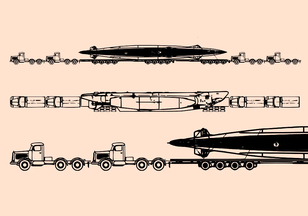 Платформы имели по 2 колесные тележки, колеса на которых располагались не только по краям, но и по центру. Каждая платформа выдерживала нагрузку около 300 тонн, одну такую платформу с подлодкой тянули 4 грузовых автомобиля марки «Фаун», 2 спереди и 2 сзади, соединенные между собой и платформой автосцепками. Перед отправкой лодки прочно закрепили на платформах тросами и накрыли чехлами.