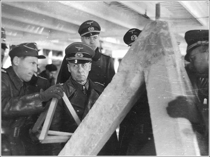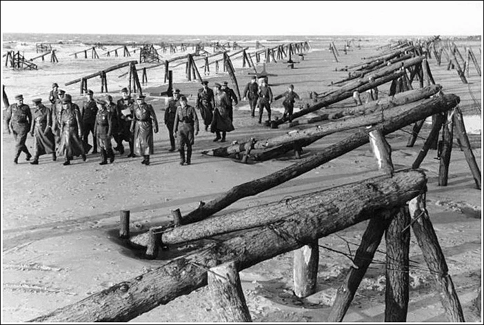 Далее ещё один ряд столбов с минами на верхушках и наклонные рампы из брёвен, тоже оборудованных тарельчатыми минами. Так называемые Hemmbalken. Вот на снимке их демонстрируют генерал-фельдмаршалу Роммелю:
