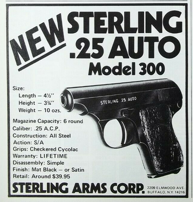 Итак, буквально за год до этого в городе Баффало, штат Нью-Йорк, открывается фирма Sterling Arms Corporation, которая изначально начинает выпускать малокалиберный пистолет, внешне напоминающий High Standard H-D и даже совместимый с ним по некоторым частям, в нескольких вариантах — укороченная «модель 285» (она же Husky), спортивная «модель T300» и облегченная «модель T300L» с рамкой из легкого сплава вместо стали.