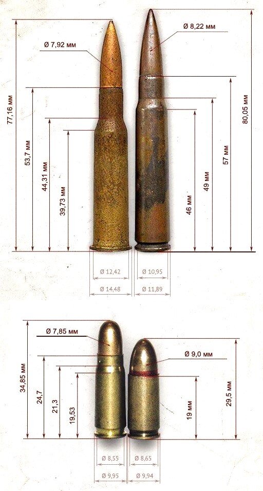 «принципиальной разницей в конструкции гильзы нашей и трофейной является то, что наша гильза при вхождении в патронник упирается своим скатом (бутылочной формы) в скат патронника оружия. Трофейная же гильза при вхождении в патронник трофейного оружия упирается своим дульцем в специальный уступ (заплечек), имеющийся в патроннике оружия».