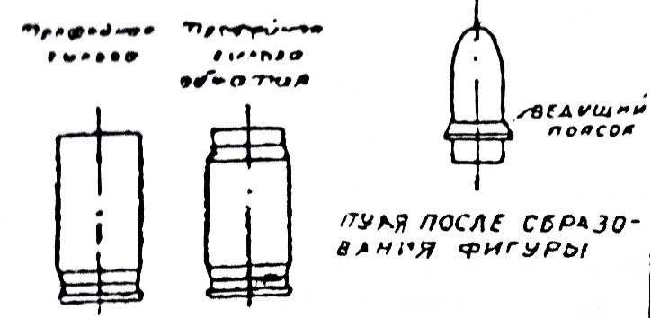 Манипуляции с трофейной гильзой были невозможны из-за ее длины — она и так была короче гильзы патрона ТТ, и конструкторы нашли оригинальный выход — сформировать на пуле специальный поясок, который бы а) служил для упора в тот самый «заплечек» и б) работал бы как ведущий поясок, имевшийся на артиллерийских снарядах: