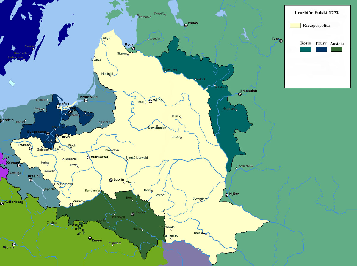России отошло Инфляндское воеводство (нынешняя восточная часть Латвии) и восточная Белоруссия с городами Витебск, Полоцк и Мстиславль. Австрия отхватила Галицию с Львовом, Галичем, Перемышлем и мало кому тогда известным городком Освенцим, а Пруссия — прибалтийскую провинцию Эрмланд (по-польски Вармия) с городами Быдгощ, Торунь и Эльблонг, тем самым установив сухопутную связь с ранее отдельной от нее Восточной Пруссией. Только Гданьск остался под властью Польши в виде изолированного эксклава в глубине прусской территории.