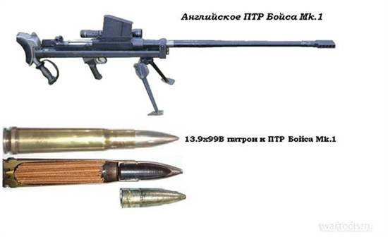 До создания своего противотанкового ружья у английского военного ведомства руки дошли только в 1934 году. И приняв решение о разработке данного вида оружия, англичане не стали откладывать дело в долгий ящик: уже в 1935 году испытали конструкцию, созданную капитаном Х. Бойсом, помощником начальника конструкторского бюро оружейного завода в Энфилде, выпускавшего стрелковое оружие. Однако, первый блин вышел комом — патрон 12,7х81, разработанный компанией Виккерс для крупнокалиберного пулемета в 1921 году, оказался слабоват даже против тех танков, которые были на вооружении в этот период. Поэтому Бойс отложил в сторону ружье и занялся патроном, который и был создан в 1936 году и получил обозначение .55 Boys (13,97×99).