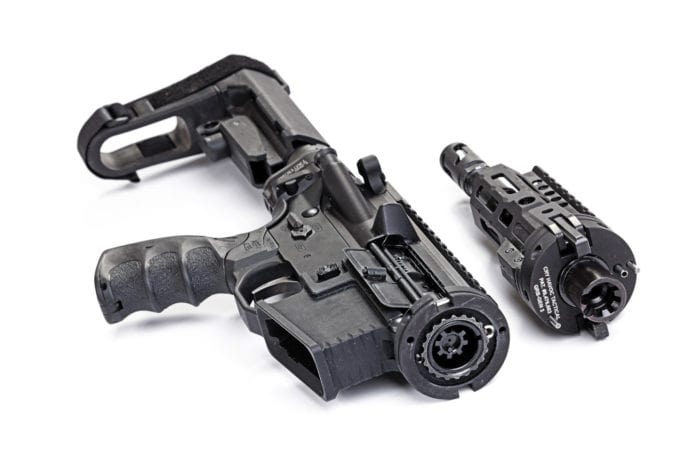 Это изделие не делает винтовку складной, но позволяет быстро отсоединять ее ствол и цевье от ствольной коробки. Доступная в виде отдельных деталей или полноценной коробки (в ограниченной серии), данная система дает явную отсылку на способ соединения пневматических шлангов с рабочим инструментом. Так, для отсоединения ствола необходимо поставить затвор на задержку, после чего провернуть соединительную гайку до надписи “unlock” и потянуть.