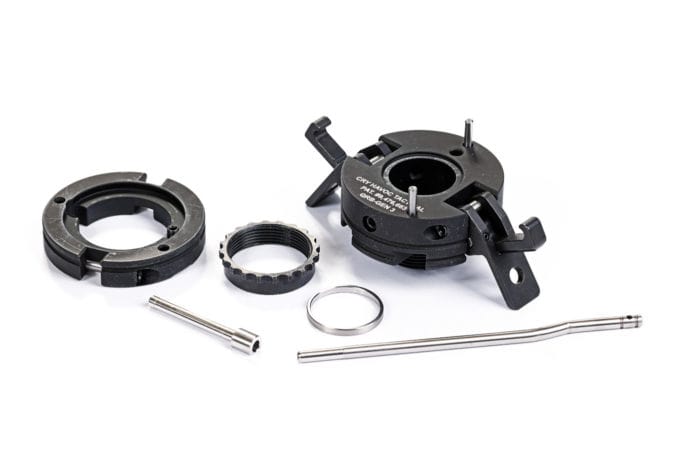 Сам адаптер крепится к ствольной коробке при помощи разрезной гайки и нескольких винтов. Кольцевой замок накручивается на ствол по полукруглому шлицу, а цевье монтируется непосредственно к нему самому на окончательном этапе сборки. Для того, чтобы привести разобранную винтовку в готовое состояние, необходимо выровнять с ответными частями газовую трубку, торцевую часть ствола и систему запирания, после чего вдвинуть ствольную часть внутрь коробки. Затем, проверните кольцевой замок так, который продвинет ствол внутрь адаптера tri-lug, собачка которого, в свою очередь, зафиксирует кольцевую гайку. Правда, стоит учитывать, что до блокировки адаптером ствол, и все установленные на нем элементы довольно подвижны, что не совсем удобно при транспортировке. Чтобы избежать этой неприятности, компания предлагает специальное стопорное кольцо для данной системы. Вдобавок к этому, производитель поставляет специальный литой кожух для газовой трубки, призванный защитить ее при перевозке или переноске разобранной винтовки.