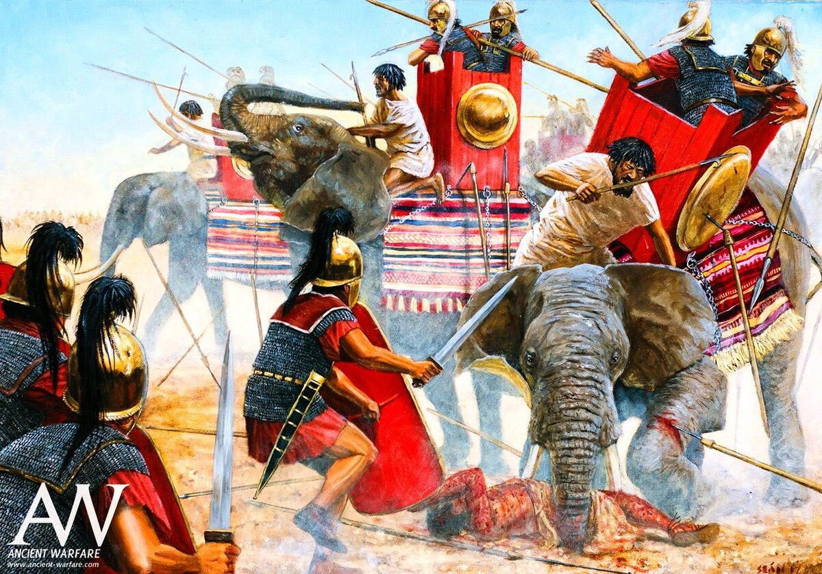 Когда эпоха эллинов в истории прошла, наступила пора Рима. А тот охотно перенимал у греков полезные привычки. В том числе и практику войны на слонах, причем еще в республиканское время. Скажем, в 197 году до н. э. в битве при Киноскефалах проконсул Тит Квинкций Фламинин применил слонов против фаланги Филиппа V. Надо сказать, что слонами обученную фалангу одолеть совсем непросто, но македоняне, дефилируя по полю боя, наткнулись на холм, который пришлось преодолевать. И во время маневра единый массив фаланги распался на две части. Правая половина сумела оперативно восстановить строй, а левая замешкалась. Вот в этот-то расстроенный фланг и ударили слонами. В итоге фалангу разбили, расчленили и обратили в бегство. Но римляне неплохо наловчились не только воевать на боевых гигантах, но и противостоять им.