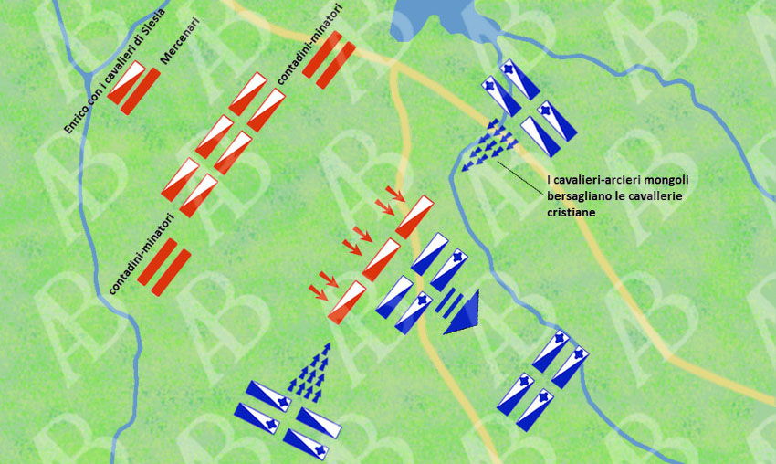 Сражение началось с красивой фронтальной атаки рыцарской конницы. Центральные конные отряды монголов, не дожидаясь мощного удара копьями, обратились в бегство. Но это был лишь обманный маневр, так как рыцари, бросившись в погоню, попали в «огневой мешок». С обоих флангов их начали обстреливать конные лучники, нанося врагу большие потери.