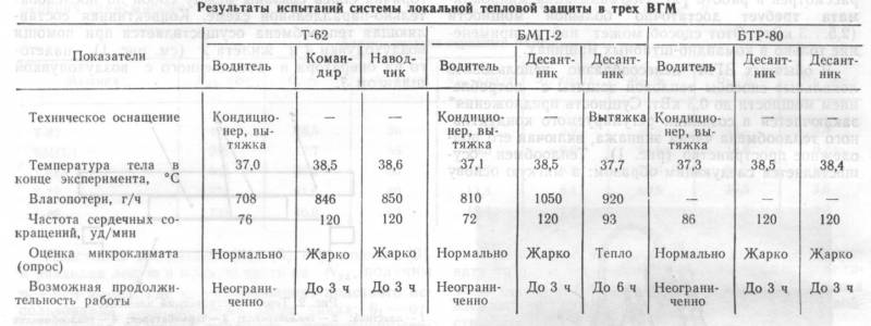 Так же, помимо танка, охлаждаемое сидение испытывалось в БМП-2 и БТР-80, где тоже показало себя хорошо. Об этом можно узнать из приложенной таблицы.