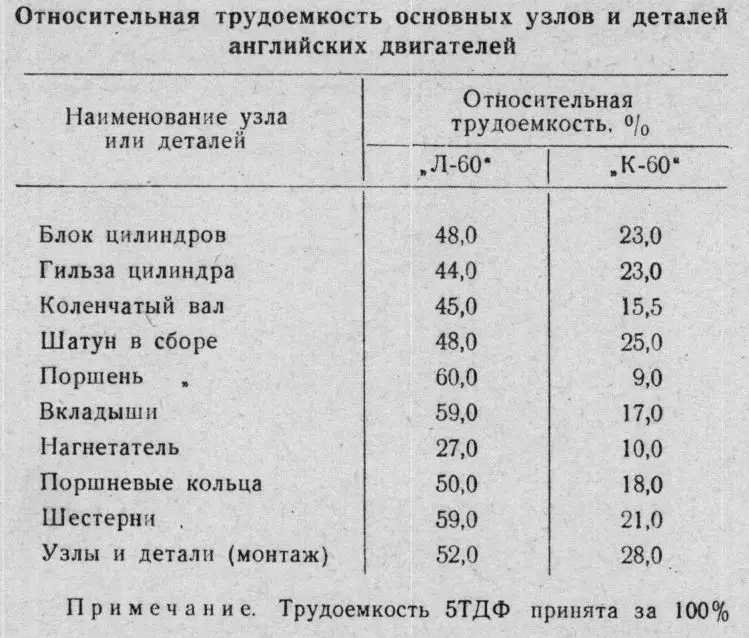 Данные по трудоёмкости основных узлов и агрегатов английских двигателей L60 и К60 сведены в таблицу, которая приложена ниже. В ней — относительные показатели, т. е. трудоёмкость 5ТДФ взята за 100 процентов. Разница очевидна.