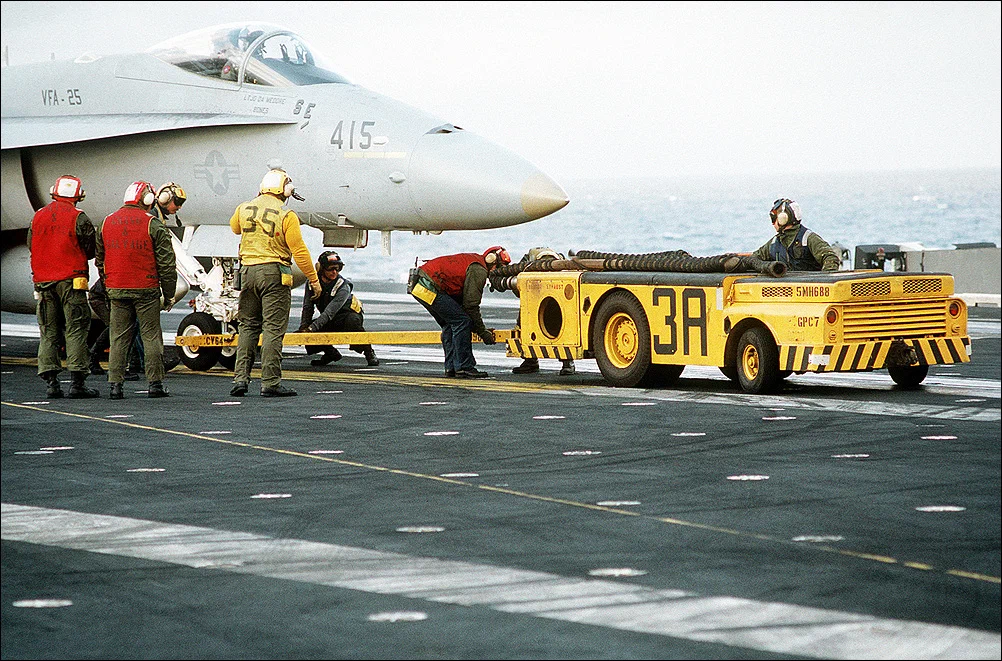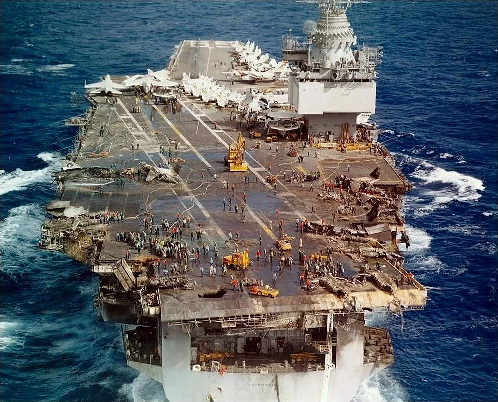Об организации. Опять же в результате расследования, было установлено, что один из рядовых оружейников заметил опасную ситуацию, сказал об этом старшине оружейнику, но тот торопился закончить вооружение самолетов и сказал об этом морпеховскому сержанту, который был наблюдателем по безопасности на палубе. Тот сказал об этом какому-то из желтых жилетов (их носят диспетчеры перемещения самолётов по палубе и в ангарах). Кому об этом сказал желтый жилет — история умалчивает, так как вскоре после этого ракета взорвалась и желтый жилет погиб. В испытаниях, проведенных после этого, оказалось, что ракета Мк-32 взрывается через 1м 18с после направления на нее выхлопа тягача. Так что все эти переговоры заняли где-то около минуты.