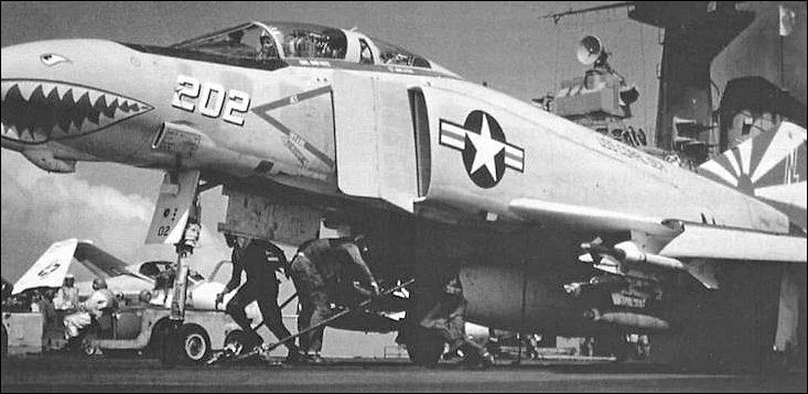 Так вот, в 8 утра была начата последняя предполётная подготовка. MD3A, управляемый техником Джоном Р. Вебстером, был подключен к правому двигателю Phantom II, пилот лейтенант Джеймс Х. Берри, и оператор лейтенант Бадди Д. Пайетт. Самолёт был полностью заправлен топливом, вместе с подвесными баками это составляло 7,4 тонны.