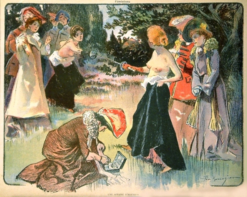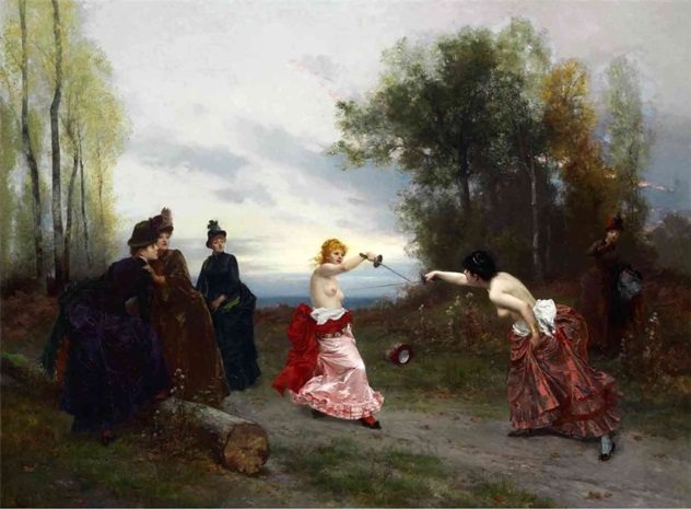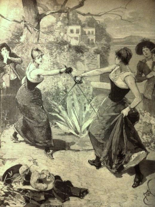 Моду на бои в полуобнаженном или обнаженном виде ввели француженки еще в XVIII веке. Для чего это делалось – непонятно. По одной из версий, чтобы обезопасить раны от попадания в них клочков одежды, по другой – чтобы не дать возможность спрятать под корсет какую-нибудь броню. Делало ли это поединки более безопасными – неизвестно, но пикатности добавляло точно. Неудивительно, что картинки женских поединков на шпагах пользовались такой популярностью в XIX веке.