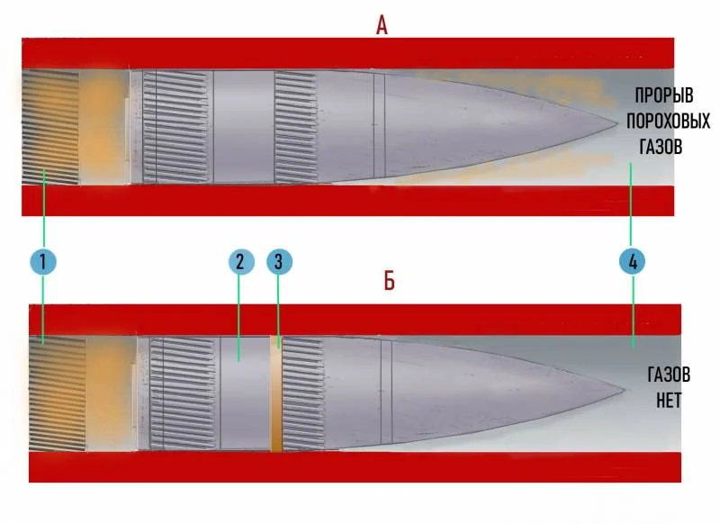 Потребовались месяцы экспериментов с десятками снарядов с нарезами самой различной формы, чтобы найти простое и изящное решение – снаряды получили не один, а два пояса готовых нарезов: один в передней части корпуса, а другой – в задней части. Диаметр корпуса снаряда между ними был несколько меньше диаметра внутренних полей нарезов. Между ними находилось медное кольцо, которое газы, прорывавшиеся через нарезы в задней части, вдавливали в нарезы передней части при переходе в гладкий ствол и этим самым исключали их вредное воздействие.