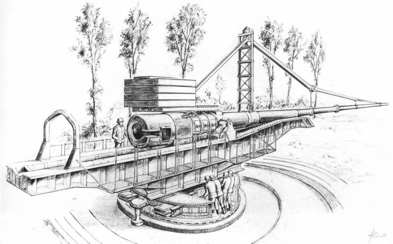 Профессор Раузенбергер, будучи техническим руководителем фирмы Круппа, предложил верховному командованию Германии сверхдальнобойную систему с радиусом действия 100 км, стреляющую 21-сантиметровыми 100-килограммовыми снарядами. Наняв в качестве посредника своего друга полковника Бауэра, начальника отдела верховного командования сухопутных войск, обратился к генералам Гинденбургу и Людендорфу с предложением изготовить и применить подобное орудие. Оба генерала одобрили идею незамедлительно, и Раузенбергер приступил к работе над пушкой. Поскольку на разработку орудия давалось всего четырнадцать месяцев, тогда как на обычные артиллерийские системы требовалось не меньше пяти лет, Раузенбергеру пришлось заняться поисками такого решения, которое позволило бы выполнить это задание с максимальной быстротой. И тут доктор Отто фон Эберхард, ассистент Раузенбергера и технический руководитель проекта, предложил решение, которое показалось Раузенбергеру слишком уж радикальным, но… подумав, он согласился, что иного пути попросту нет.