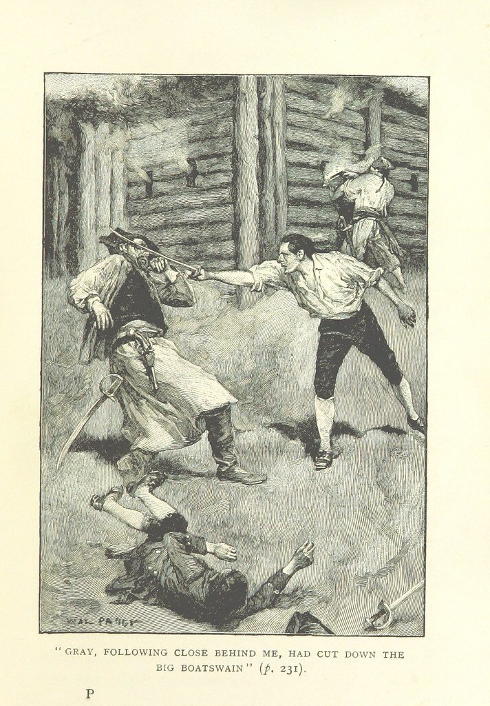 Роман был впервые опубликован в 1883 году, но повествует о событиях середины XVIII века, и Р. Стивенсон вряд ли представлял себе какие абордажные сабли были в ходу в те времена, тем более, что к концу XIX века в английском военном флоте они уже успели несколько раз смениться. Не представлял это и художник, который иллюстрировал роман в 1899 году, а потому нарисовал хоть и абордажные сабли, но за образец взял те, которые бытовали именно во второй половине XIX века — на это указывает как форма эфеса, так и форма клинка (кстати, многим современным иллюстраторам следовало бы поучиться, а то иной раз такое рисуют вместо нормального оружия, что хоть святых выноси).
