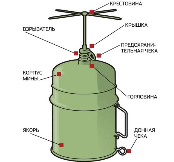 Мина состоит из корпуса с зарядом ВВ и взрывателем ВРМ 2, и якоря с механизмом автоматической установки на заданное заглубление.