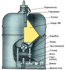 Корпус металлический, сварной, в нижней части внутри его приварен конус, заполненный зарядом ВВ. Свободный объем внутри корпуса служит камерой плавучести.