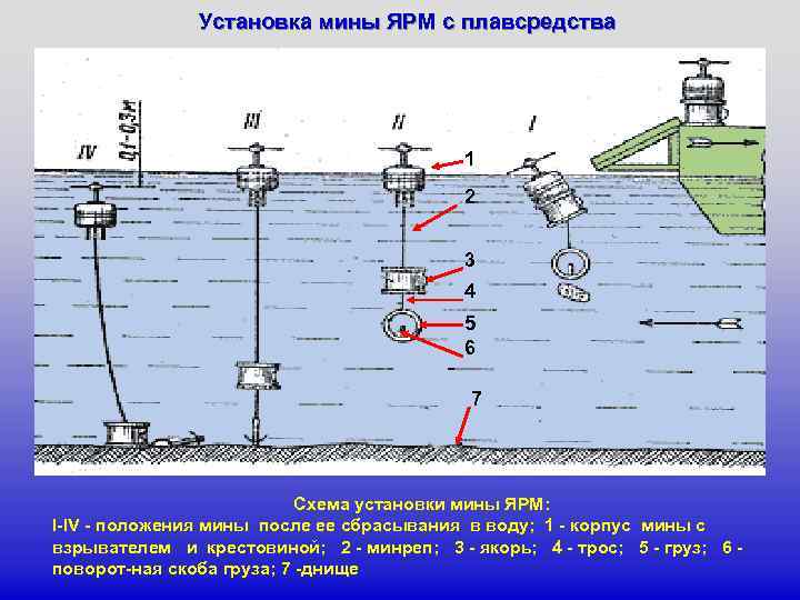 IV. Якорь, продолжая погружаться до дна водоема, увлекает под воду корпус мины на заглубление, заданное длиной штерт-троса.