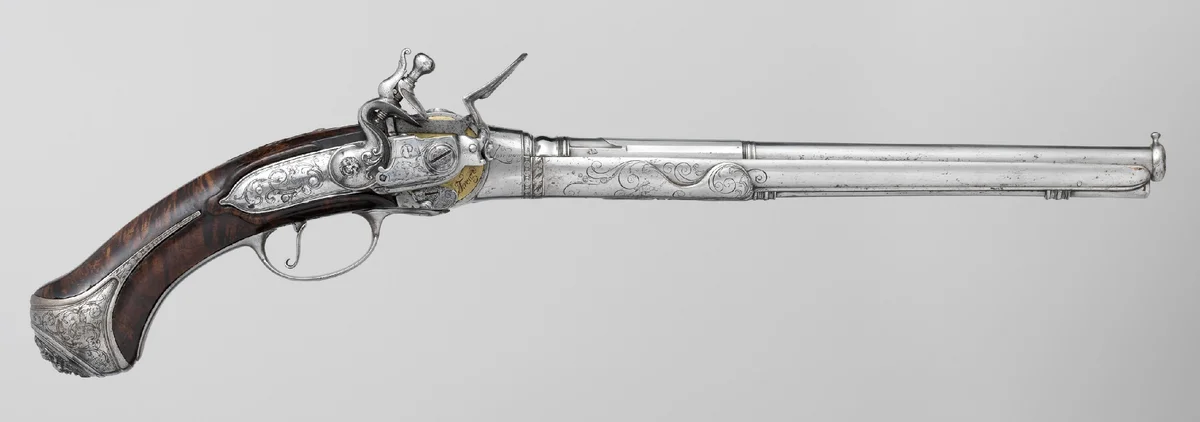 Пистолет с ударно-кремневым замком (далее ПУКЗ) был изготовлен около 1700 года, имел длину ствола 332 мм, весил 1.16 кг, калибр 13,7 мм. Стреляли из него круглой пулей диаметром 13,5 мм, весом 14,45 г. Заряд черного пороха весил 5 г.