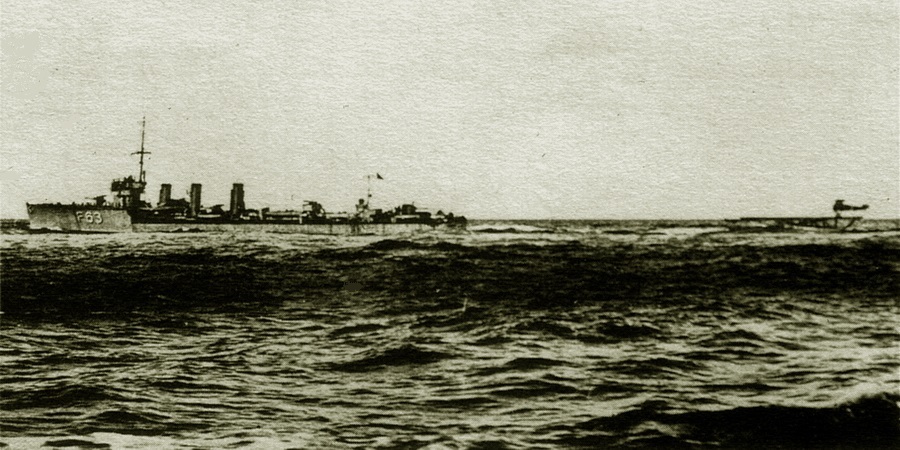 Облачность сильно ограничивала видимость даже с относительно небольшой высоты в 6000 футов. Время шло, а эсминцы всё никак не обнаруживались. Главный бензобак опустел, и горючее осталось лишь в расходном бачке. В отдалении виднелись рыболовецкие суда, и пилот решил приводниться рядом с ними, но по мере приближения «рыбаки» всё больше увеличивались в размерах и в итоге оказались боевыми кораблями.