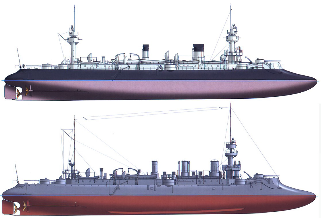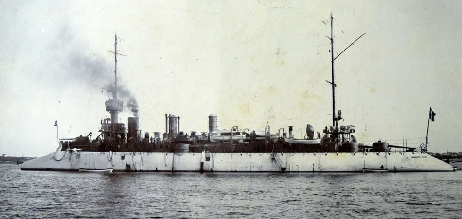 Крейсер на полном ходу. Испытания показали, что его паровые машины вместо расчетной мощности в 14000 лошадиных сил могли развивать только 13000, да и то — лишь короткое время. Из-за этого максимальная скорость оказалась ниже проектного значения — не 20, а 19 узлов.