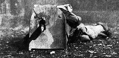На мой взгляд, данный факт выглядит довольно странно. Ведь именно в 30–40 годы прошлого века на вооружение всех армий мира стали массово поступать пистолеты-пулеметы, патроны которых имели куда меньшую пробивную способность, чем винтовочные, а стало быть, и боевая эффективность штурмовых щитов резко возрастала. Я могу найти этому лишь одно объяснение: ценность человеческой жизни в тот период, как это ни прискорбно, стала резко падать. Поставить под ружье лишнюю тысячу безмолвных солдатиков было гораздо проще, чем заниматься разработкой, изготовлением, транспортировкой различных защитных приспособлений, которые можно будет использовать в очень узком спектре боевых ситуаций.
