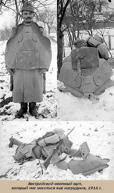 В период Первой мировой войны пуленепробиваемые щиты использовались практически всеми странами участниками конфликта, однако их повсеместного и массового применения, увы, не состоялось. Основная причина тому тяжесть всех без исключения конструкций и неудобство в обращении.