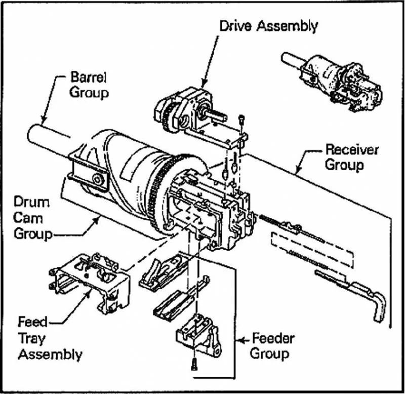 На переднюю часть ствольной коробки, оснащенную кольцевыми направляющими, конструкторы буквально надели барабан новой конструкции. От детали гранатомета M75 он отличался большими размерами и иной формой направляющих. Передний торец барабана имел отверстие для выхода ствола. Его цилиндрическая стенка получила внутреннюю канавку-направляющую для взаимодействия с зацепом ствола. Сзади снаружи на барабане имелся крупный зубчатый обод, соединявшийся с редуктором электромотора. На своем месте барабан удерживался внутренними направляющими и U-образной деталью, находившейся возле его передней стенки.