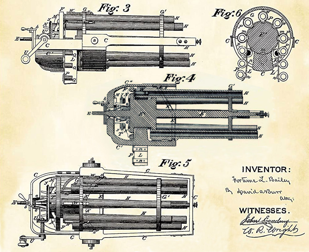 В начале 1876 года, была запатентована и прошла испытания весьма интересная, но почти неизвестная даже знатокам оружия штуковина, а именно — так называемый пулемет Бэйли. Чертеж общего вида из его патента и разрез казенной части помещены на заглавном рисунке.
