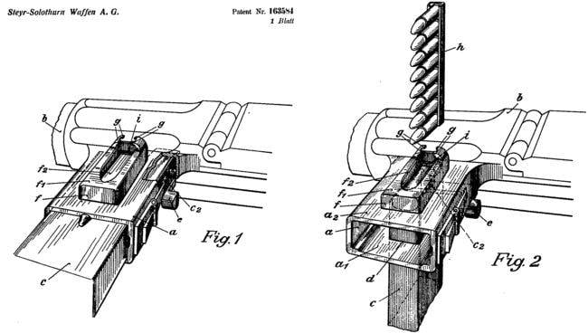 Питание патронами осуществлялось из коробчатых двухрядных магазинов, примыкаемых горизонтально слева. В горловине магазина имелось специальное запатентованное приспособление для наполнения магазина патронами из обойм; отсоединенный магазин вставлялся в это приспособление снизу, сверху вставлялась обойма,. из которой патроны рукой выдавливались вниз, в магазин. Для полного снаряжения магазина требовалось 4 обоймы.