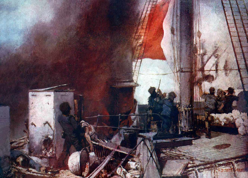 11.Палуба «Уаскара» во время боя. После гибели капитана и большинства офицеров корабль спустил флаг.
