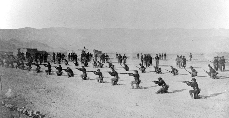 17.Чилийская армия наступает под огнем мимо погибшего боливийского артиллерийского расчета.