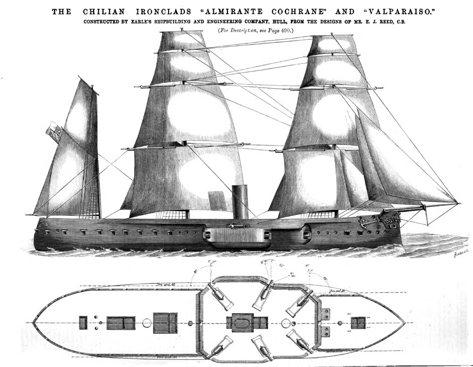8.Однотипные казематные броненосцы «Альмиранте Кокрейн» и «Вальпараисо» составляли к 1879 году основу чилийского флота.