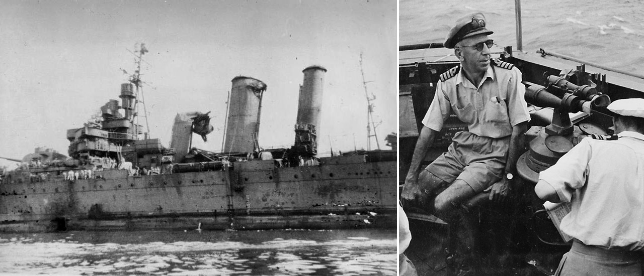 21 октября 1944 года, японский пикирующий бомбардировщик Аити D3A «Вэл» врезался в капитанский мостик флагмана австралийского флота, тяжелого крейсера «Австралия», осуществлявшего огневую поддержку высадки американских войск на Филиппинах. При этом погибли 23 матроса и семь офицеров, включая командира корабля, капитана Эмиля Дешана.