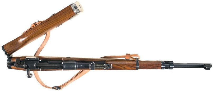 Вполне понятно, что прыгать с винтовкой -ну вообще не вариант. Поэтому для облегчения транспортировки оружия, фирма Mauser разработала два варианта карабина для парашютно-десантных войск люфтваффе —«Fallschirmjager-Karabiner 98k»: первый вариант- в 1938 г — карабин с откидным вбок прикладом, получившим обозначение 33/40 Klappschaft и второй вариант -в 1942 г — разбирающийся на две части карабин -собственно «Fallschirmjager-Karabiner 98k».