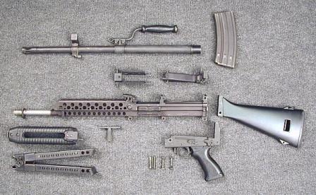 Для винтовочных и карабинных конфигураций газоотводный механизм находился над стволом, а для пулемётных — под стволом, что требовало переворачивания ствольной коробки «вверх ногами». Такое решение было нестандартным, но позволило достичь невероятной адаптивности.