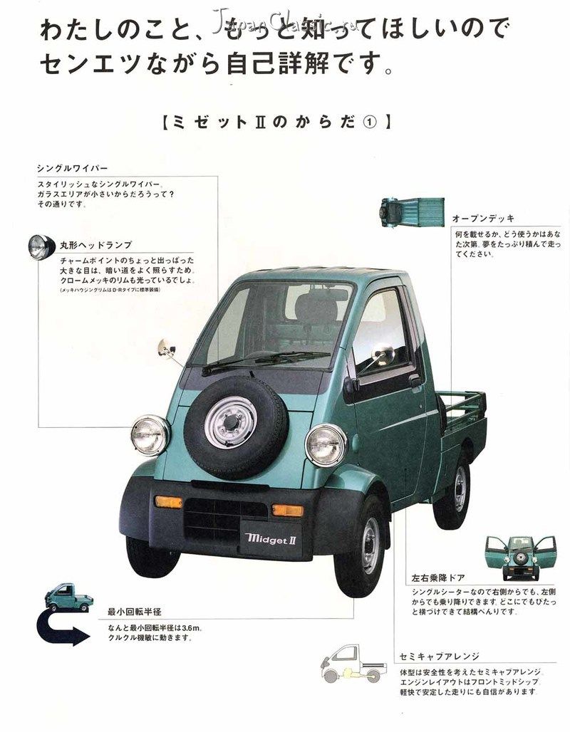 Этот маленький симпатичный грузовик выпускался в Японии с 1996 по 2001 год. Не смотря на свои размеры имел полный привод на все колеса и выпускался с кузовами универсал и пикап. Запасное колесо, которое располагалось впереди, и круглые, широко посаженые, фары придавали автомобилю довольно смешной вид, делающим его похожим на какое то насекомое. Посадочное место в салоне лишь одно, а все остальное пространство было рассчитано на перевозку грузов.