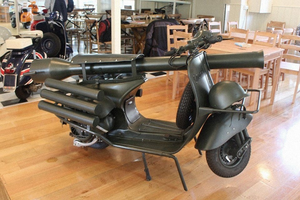 Двухколесная САУ Vespa 150 TAP по праву может считаться самым странным образцом вооружения в своем классе. Удивить кого-то более странной разработкой будет крайне сложно. Боевая машина была создана на базе итальянского мотороллера и безоткатной американской пушки М-20. Создатели Vespa 150 TAP из А.С.М.А. — «Ателье по конструированию мотоциклов и автомобилей» решили, по всей видимости, объединить две вещи: скорость (мотороллер разгонялся по шоссе до 120 км/ч) и огневую мощь, практически танковую. Мотороллер нес на себе 75-мм безоткатное орудие. К примеру, на знаменитом советском танке Т-34 основным огневым средством была 76,2-мм пушка.