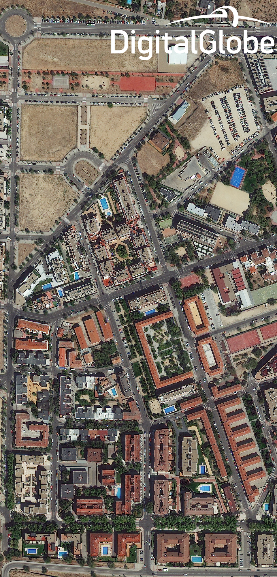Как видим, на этом снимке Мадрида можно рассмотреть множество подробностей: легковые машины вполне отличимы от грузовых, даже, кажется, купающихся людей в бассейнах можно рассмотреть в виде точек. Но Мадрид выбран неслучайно: чем ближе к экватору, тем меньше облачность. Еще для демонстрации возможностей спутников часто выбирают Дубай — там много всяких колоритных объектов, и пустынная погода способствует наблюдению.