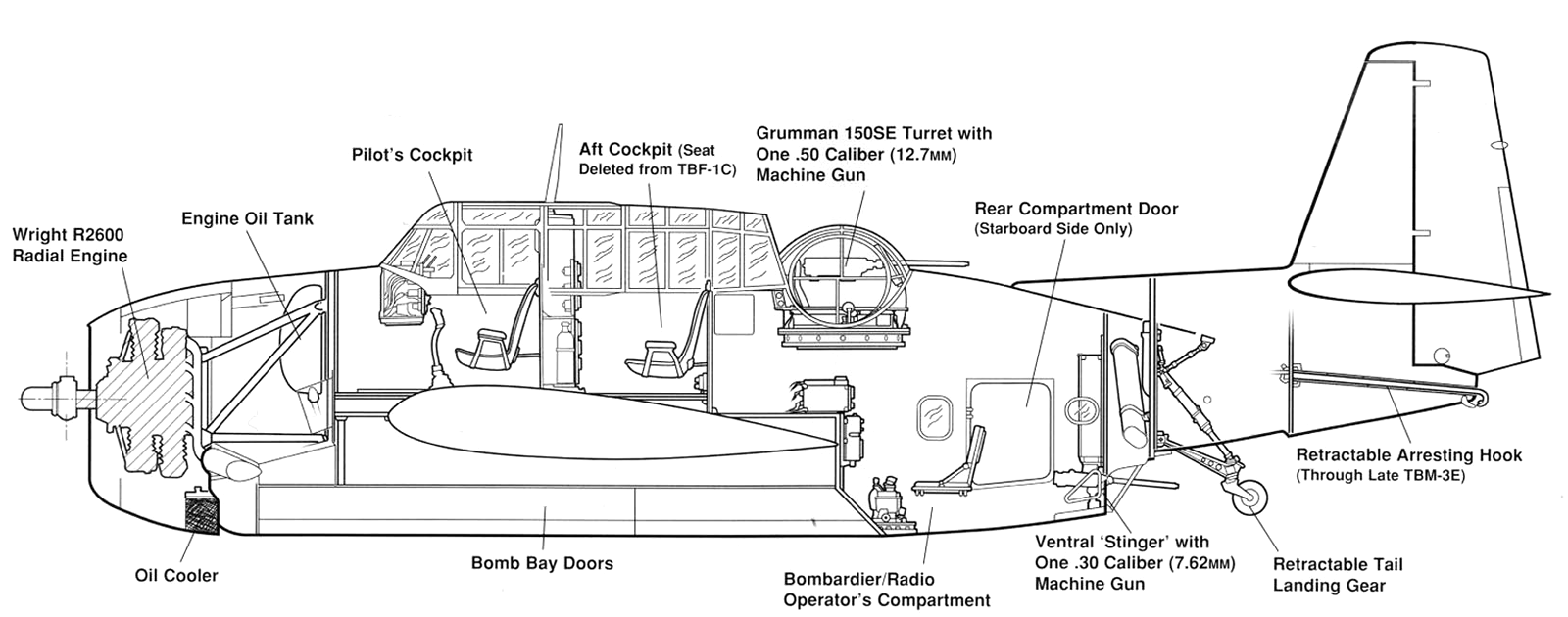 Короткий фюзеляж типа полумонокок имел овальное сечение, создан из ряда угловых силовых рам (шпангоутов) и штампованных перегородок, закрытых гладкой металлической обшивкой. Среднерасположенное крыло имело прямоугольное сечение центральной секции и равносужающиеся складывающиеся наружные секции. Оно имело цельнометаллическую однолонжеронную конструкцию с металлической обшивкой с потайной клепкой, щелевые закрылки, размещенные между элеронами и центральной секцией. Складывание и раскладывание наружных частей крыла осуществлялось гидравлически. Опоры с масляным амортизатором крепились шарнирно в оконечностях центроплана и убирались в наружную (от фюзеляжа) сторону, в ниши наружных частей крыла. Хвостовое колесо полностью выдвигалось. Катапультные точки и выдвигающийся тормозной гак с электрическим приводом размещены в хвостовой части. TBF был хорошо спроектирован и почти не бился.