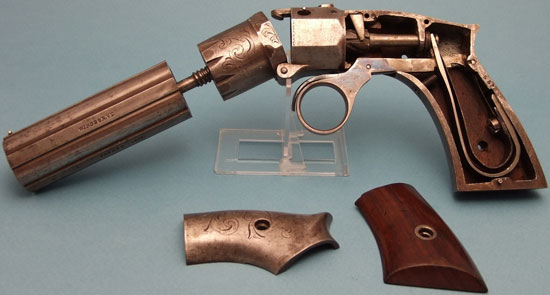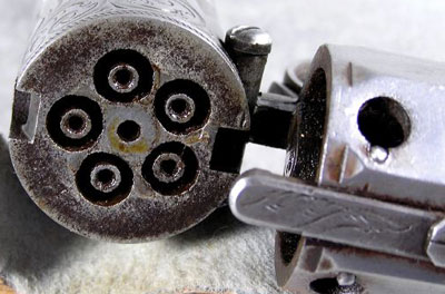 Pepperbox Robbins & Lawrence имеет капсюльный замок с двойным действием. Ударный механизм спрятан в казенной части оружия.