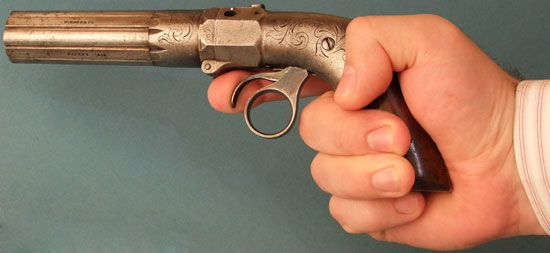 При нажатии на кольцо, расположенное под корпусом, взводится ударник и переводится на следующий ствол. После взведения ударника, от кольца отделяется небольшая скоба, которая и служит спусковым крючком.