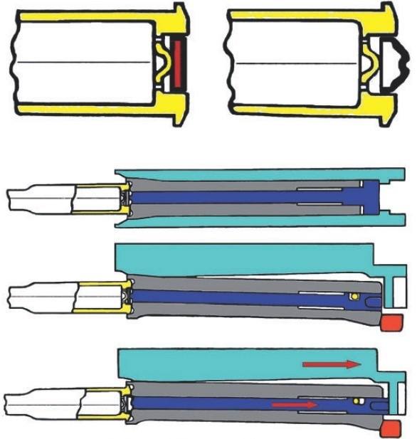 «Двигатель начинает действовать практически одновременно с началом горения заряда и работает до момента завершения выпучивания капсюля. Это составляет несколько тысячных долей секунды, даже меньше общего времени выстрела. За это время ударник с затворной рамой проходят участок деформации капсюля (всего около 3 мм) и разгоняются до максимальной скорости. Если не предпринять мер к отсрочке присоединения затворной рамы к затвору, отпирание будет происходить в период действия в стволе достаточно большого давления. Именно поэтому в начале стрельбы возникают задержки, являющиеся следствием раннего отпирания и большой скорости подвижных частей – остаточное давление в стволе, действующее на дно гильзы после отпирания, дополнительно ускоряет откат подвижной системы. Нагрев патронника по мере настрела увеличивает усилие экстракции гильзы, и в этот момент начинает проявляться недостаточная мощность двигателя – ее не хватает, чтобы придать подвижным частям энергию, достаточную для извлечения гильзы».