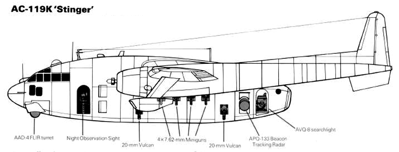 На АС-119G были установлены средства РЭБ, стандартно радиолокационное оборудование, а также базовые системы, которые включали в себя: ксеноновый фонарь AVQ-8, прицел ночного видения и установка на 24 заряда LAU-74/A для запуска 24 осветительных ракет. А вот Стингер был более совершенным. В него установили доплеровский навигационный радар AN/APN-147, инфракрасный радар прямого обзора AN/AAD-4, радар слежения AN/APQ-133 и поисковый радар AN/APQ-136. Где еще было столько радаров?